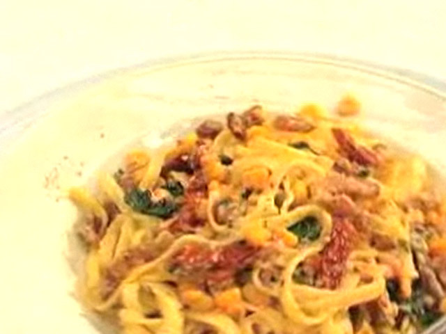 Феттучини со сладкой кукурузой и сыром горгонзолой. Итальянская кухня.На 2 порции:феттучини — 250 гр;кукуруза — 100 гр;маскарпоне — 3 столовых ложки;горгонзола — 80 гр;сушенные помидоры — 4-5 штук;порей — 4 стебля;базилик, петрушка, белое вино, соль, черный перец, оливковое масло.